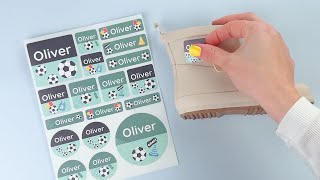 Willst Du Namensaufkleber, die wirklich auffallen? Unsere großen Namensaufkleber sind dafür gemacht, sich abzuheben, auf dem Turnbeutel, der Brotdose und den Gummistiefeln. Sie sind strapazierfähig, wasserfest und ein Set beinhaltet verschiedene Formen und Größen, sodass Du ganz einfach alles von Schuhen bis Sportausrüstung markieren kannst.